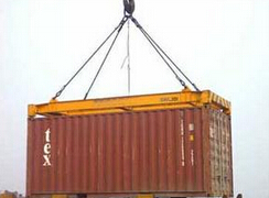 操作流程:首先将吊具的四根主起生钢丝绳索具和一根转向弹性钢丝绳置于门机吊钩内,在吊装前指针指向打开方向,利用吊具四侧的定位装置,使吊具的四只转锁置入集装箱的箱角内,然后使吊钩缓慢起升,弹性钢丝绳首先张紧并拉动转向机构使转锁旋转90度至闭合状态,继续提升吊钩即可吊起集装箱。